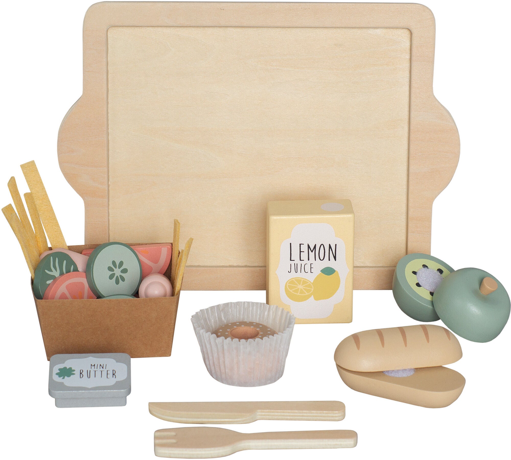 329,00 krSkärbräda från JaBaDaBaDo i trä med leksaksmat. Setet innehåller en baguette med smör, en kiwi, lite grönsaker, fika och en citronjuice. Perfekt för timmar av fantasifull lek.